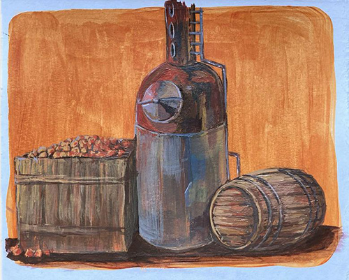 After this successful trial, it was clear there were many opportunities ahead. All I had to do was choose the appropriate ciders and perries to get the best results. Encouraged by the first run we took a portion of the Foxwhelp distillate and a quarter cask Laphroaig barrel, poured in the juice of Yarlington Mill cider apples, and then let the mix rest for almost 12 months. What emerged after this short sleep? A liquid similar to, but certainly not, a pommeau. The 19% abv confluence of wood, smoke, apple, vanilla, clove, and spice is more like a plum pudding delight, sweet enough to let the warming spirit sing, but perfect as an after-dinner drink. “Grist for the Mill” is our second creation and has met with a lot of appreciation.